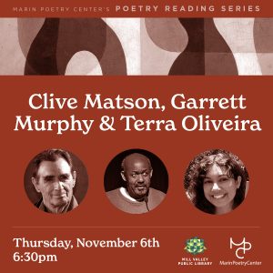 MPC Reading Series: Clive Matson, Garrett Murphy & Terra Oliveira November 2025 Thursday, November 6th, 2025, | 6:30- 8:00 pm | Location: ... 06 Nov 6:30 pm - 8:00 pm Mill Valley Public LibraryMill Valley Public Library, 375 Throckmorton Ave, Mill Valley, CA 94941 AdultsLiteraryLiterary PartnersReading Series