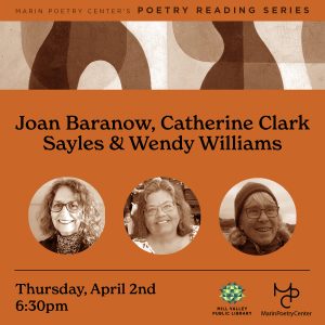 MPC Reading Series: Joan Baranow, Catharine Clark-Sayles & Wendy Williams April 2026 Thursday, April 2nd, 2026, | 6:30- 8:00 pm | Location: ... 02 Apr 6:30 pm - 8:00 pm Mill Valley Public LibraryMill Valley Public Library, 375 Throckmorton Ave, Mill Valley, CA 94941 AdultsLiteraryLiterary PartnersReading Series