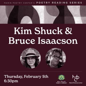 MPC Reading Series: Kim Shuck & Bruce Isaacson February 2026 Thursday, February 5th, 2026 | 6:30- 8:00 pm | Location: ... 05 Feb 6:30 pm - 8:00 pm Mill Valley Public LibraryMill Valley Public Library, 375 Throckmorton Ave, Mill Valley, CA 94941 AdultsLiteraryLiterary PartnersReading Series
