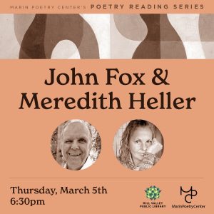 MPC Reading Series: John Fox & Meredith Heller March 2026 Thursday, March 5th, 2026, | 6:30- 8:00 pm | Location: ... 05 Mar 6:30 pm - 8:00 pm Mill Valley Public LibraryMill Valley Public Library, 375 Throckmorton Ave, Mill Valley, CA 94941 AdultsLiteraryLiterary PartnersReading Series